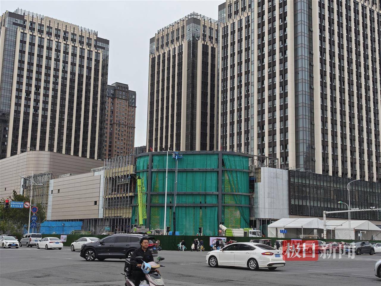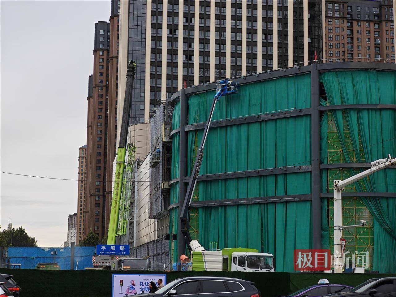 “三胖”位于新乡市平原路与牧野大道(中)交叉口西南角,国庆假期的第六天,也正值中秋节。记者看到,整个现场被施工围挡围住,场内工人们正有序施工。围挡上的喷淋设施在不停地作业车优配,以起到降尘作用。